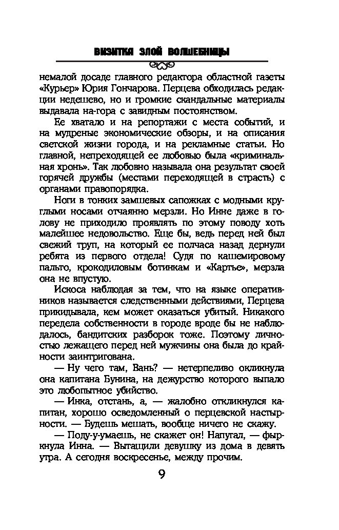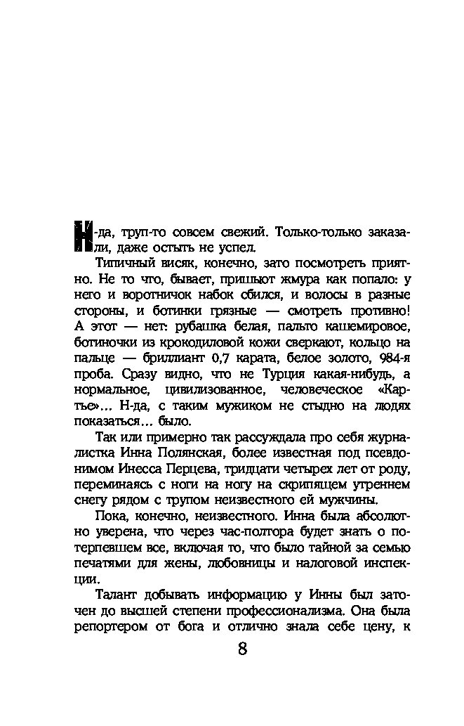 Инна Полянская, более известная под псевдонимом Инесса Перцева, была репортером от бога! Перцева обходилась редакции недешево, но громкие скандальные материалы выдавала с завидным постоянством. Даже ее собственный брак не обошелся без интриги: Инна тогда уволилась из газеты и устроилась посудомойкой в кафе Ледового дворца, чтобы привлечь внимание понравившегося ей хоккеиста!.. Вот и сейчас она взялась за острую тему — убийство исполнительного директора процветающей страховой компании «Берег. Богатый бизнесмен, женатый на победительнице городского конкурса красоты, расстрелян его сыном Глебом от первого брака — это первая полоса, как пить дать! Но постепенно холодный профессиональный интерес сменился искренним сочувствием: оказалось, Инна знала Глеба с детства, и теперь его убитая горем мать попросила журналистку доказать его невиновность…