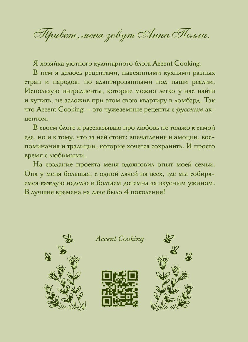 Анна Полли — популярный блогер и автор проекта Accent Cooking. В нем она преобразует яркие рецепты из разных уголков мира, добавляя к ним русский акцент, и делится секретами домашнего уюта.
