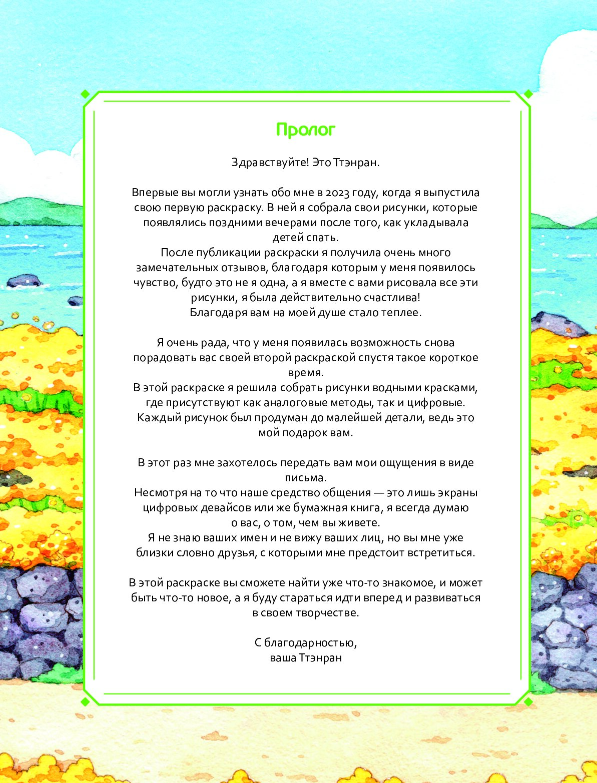 Каждый рисунок — это акварельная иллюстрация, в которой иллюстратор Ттэнран передает свою уникальную атмосферу и нежность. В книге собрано 26 потрясающих рисунков, которые легко раскрашивать.