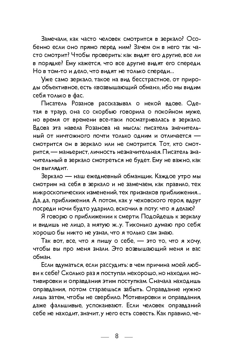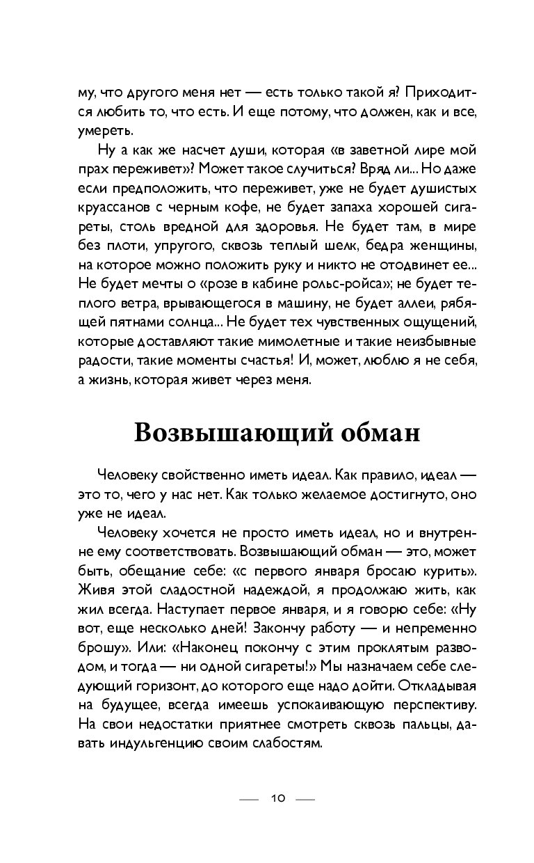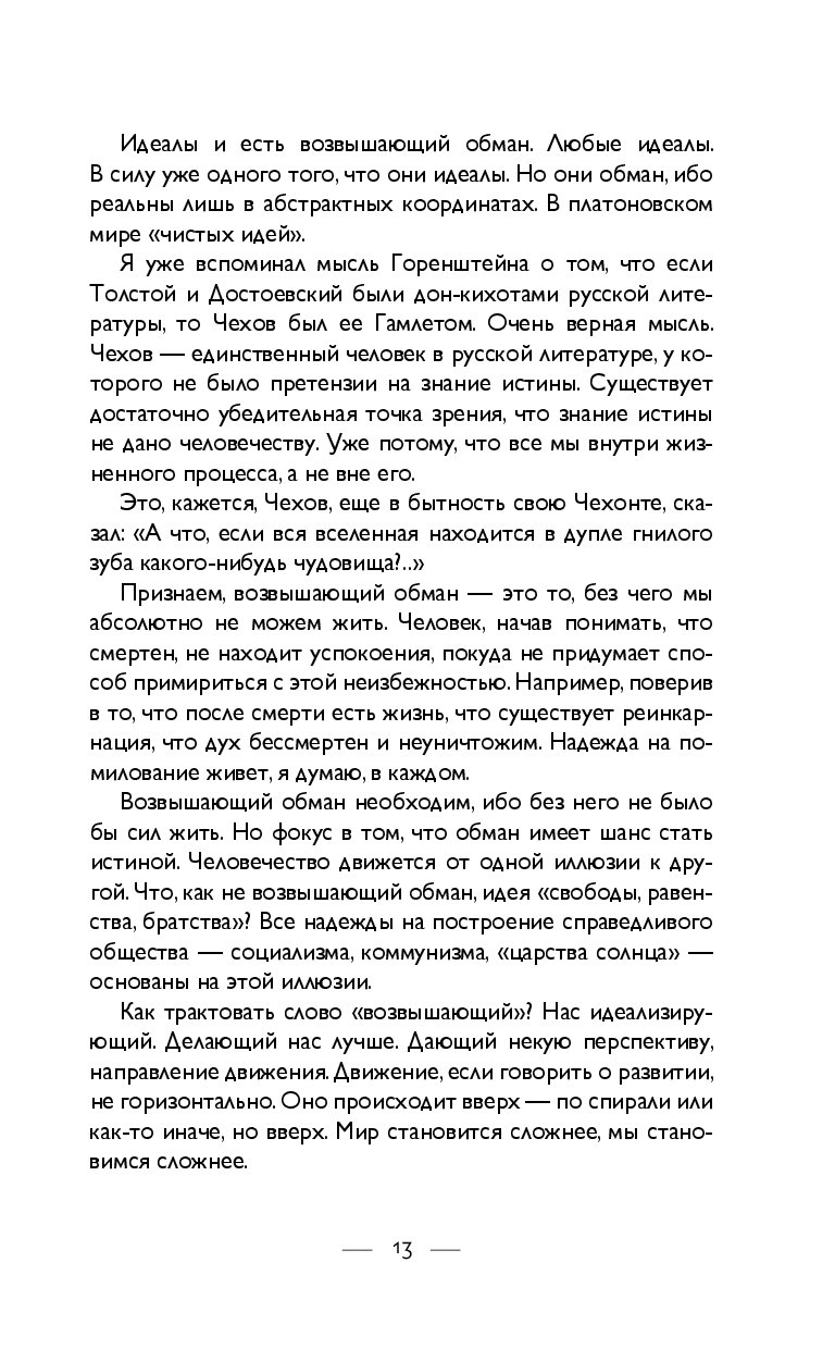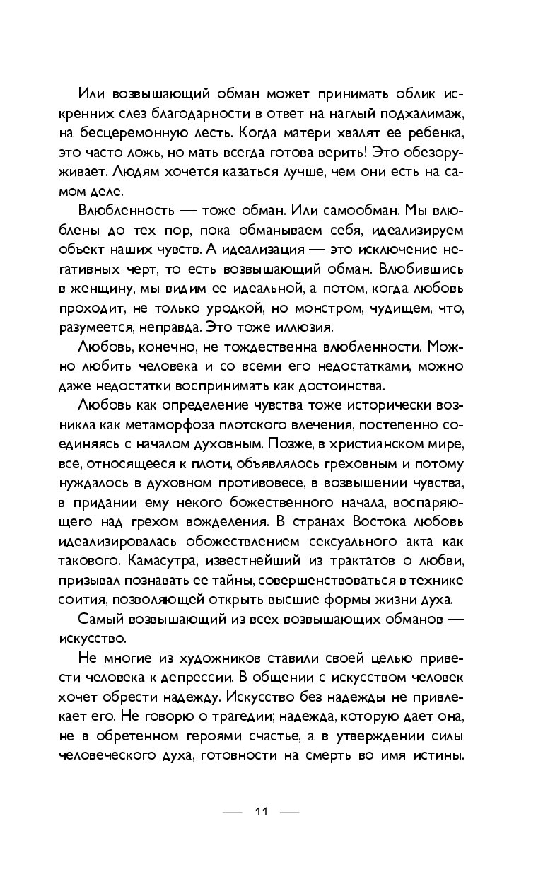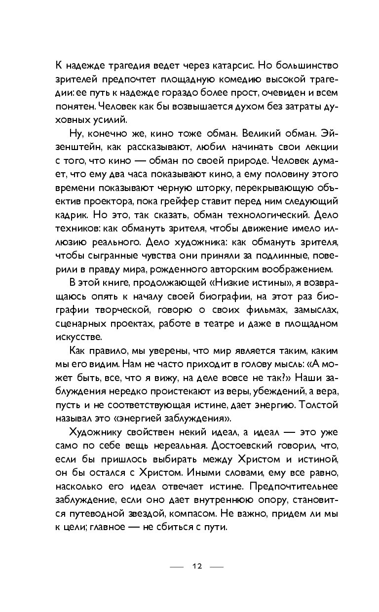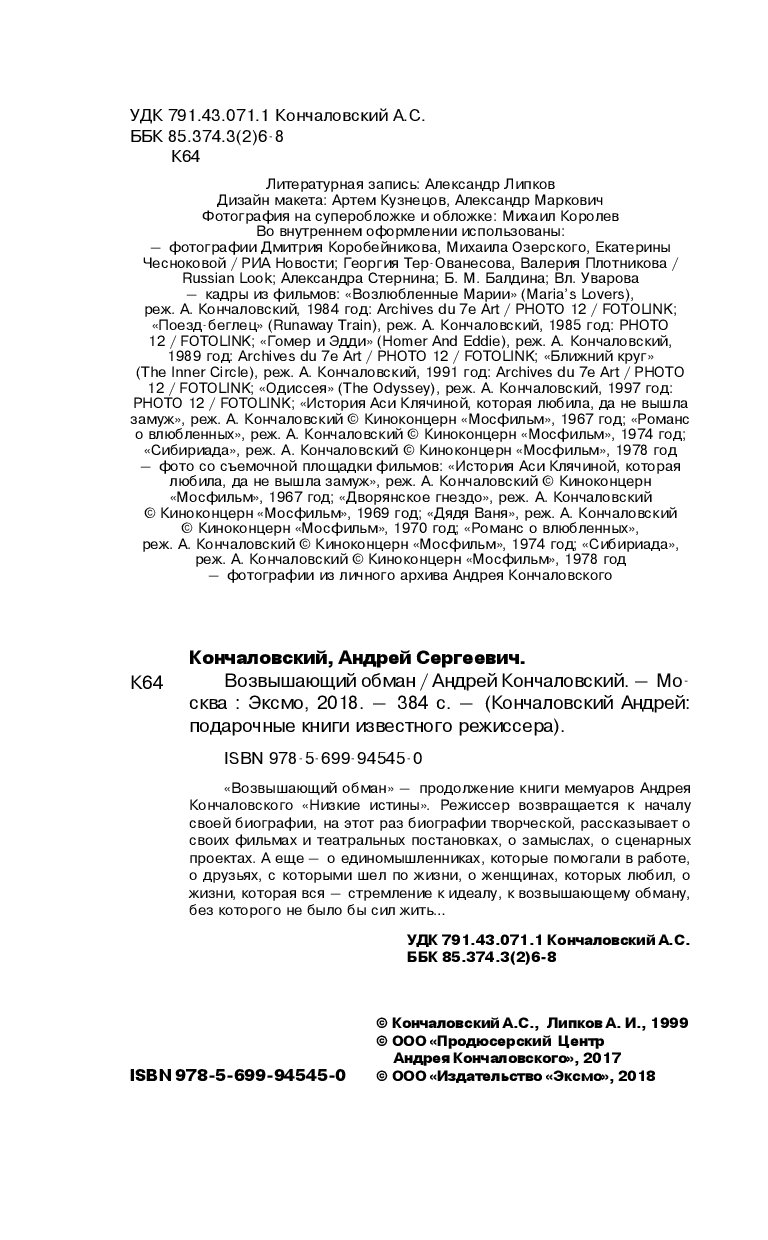 «Возвышающий обман» — продолжение книги мемуаров Андрея Кончаловского «Низкие истины». Режиссер возвращается к началу своей биографии, на этот раз биографии творческой, рассказывает о своих фильмах и театральных постановках, о замыслах, о сценарных проектах. А еще — о единомышленниках, которые помогали в работе, о друзьях, с которыми шел по жизни, о женщинах, которых любил, о жизни, которая вся — стремление к идеалу, к возвышающему обману, без которого не было бы сил жить…