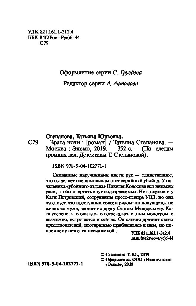 Татьяна Степанова – подполковник полиции, потомственный следователь с престижным юридическим образованием. Не понаслышке знает обо всех громких делах и их расследовании. Поэтому в ее книгах следствие ведут профессионалы. Книги писательницы позволяют читателю побывать в литературной «комнате страха». Таинственные убийства, почти осязаемая атмосфера преступления, томительное и тревожное ожидание чего-то неведомого, пугающего...  Романы Татьяны Степановой — классические детективы, написанные по всем законам жанра! Из-под пера автора вышло 40 романов, проданных суммарным тиражом более 8 миллионов экземпляров.