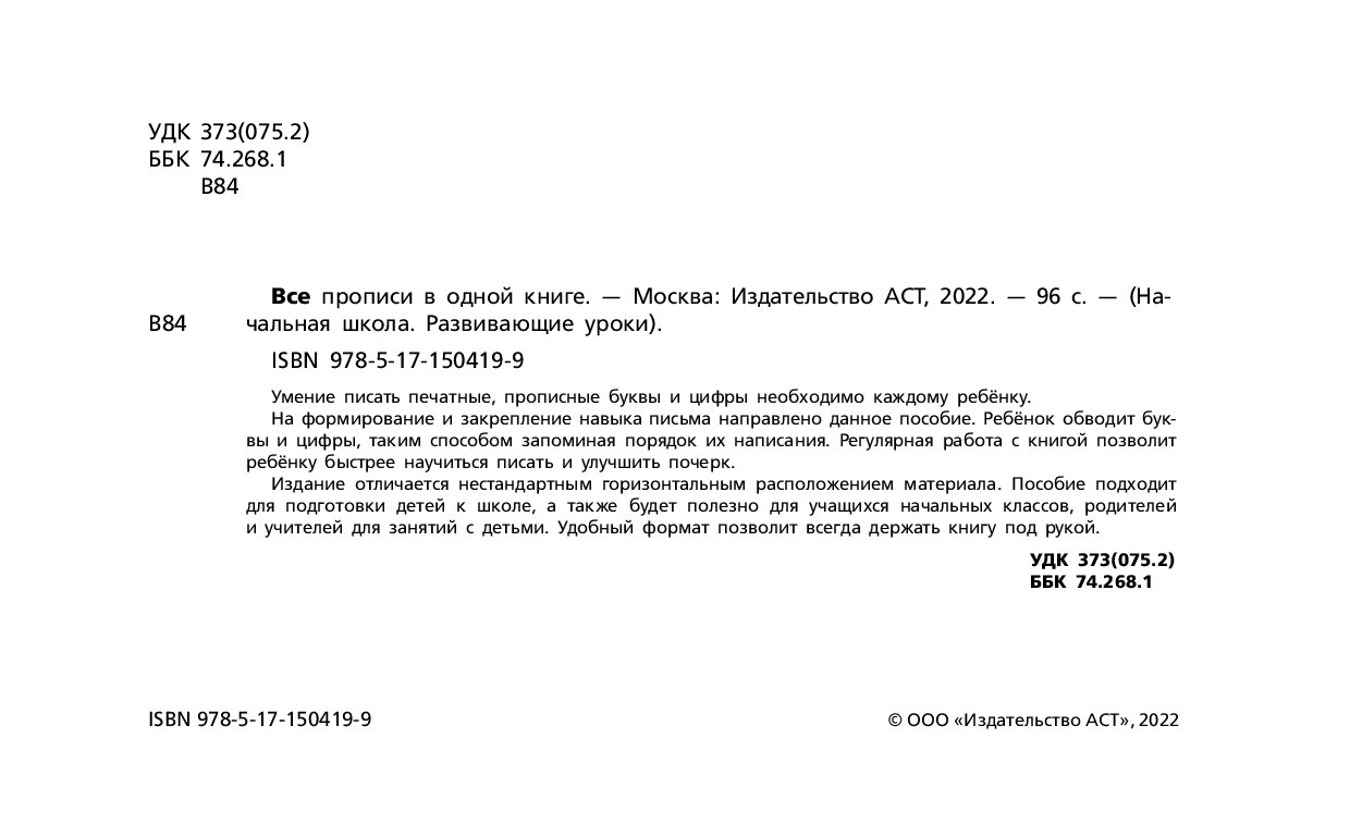 Купить книгу Все прописи в одной книге в интернет-магазине Book24.kz можно по лучшей цене. Напрямую сотрудничая с издательствами, мы сохраняем доступную стоимость всех книг и предлагаем покупателям выгодные условия продажи. Гарантируем адресную доставку заказов по Казахстану в течение 1-9 дней, отправляем книги Казпочтой и EMC Актау, Актобе, Атырау, Караганду, Кокшетау, Костанай, Кызылорду, Павлодар, Петропавловск, Талдыкорган, Тараз, Уральск, Усть-Каменогорск, Шымкент, Алматы, Астану и другие города. Заказать книгу у нас не составит труда, стоит только выбрать из каталога интересующее издание с фото и кратким описанием и сделать оформление заказа по телефону или онлайн. Мы позаботимся, чтобы вы получили книгу как можно скорее.
