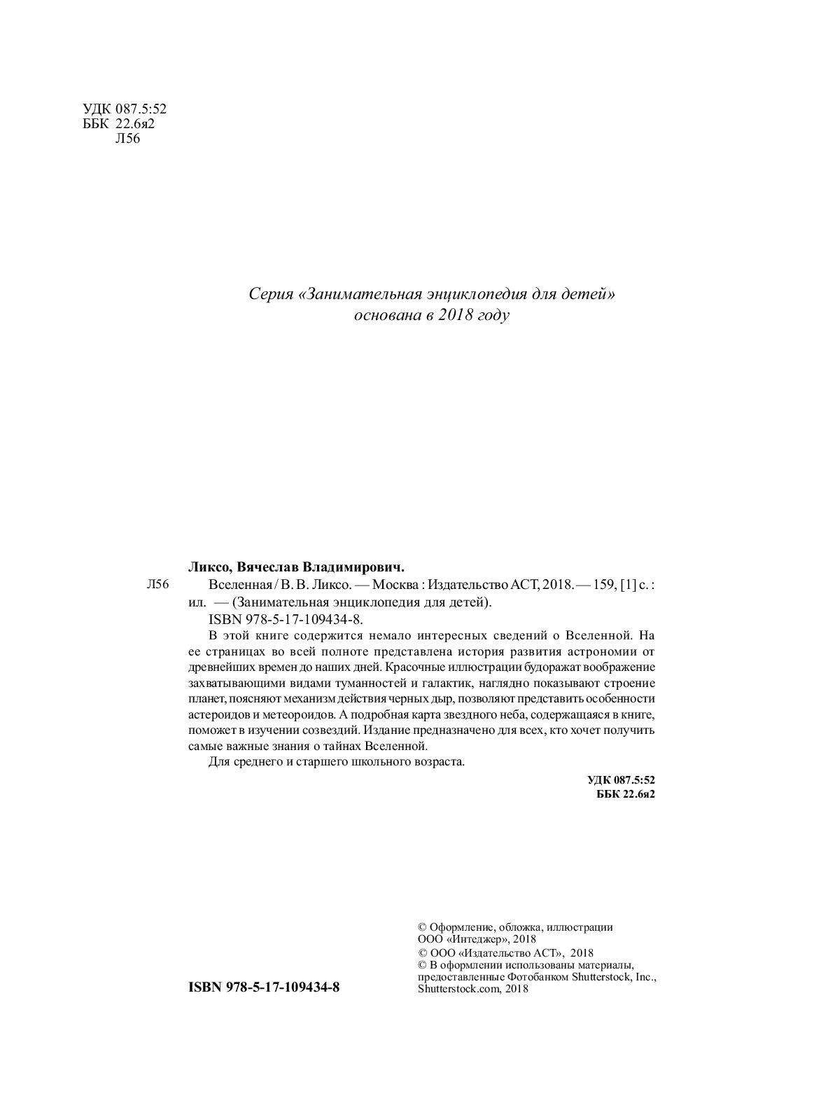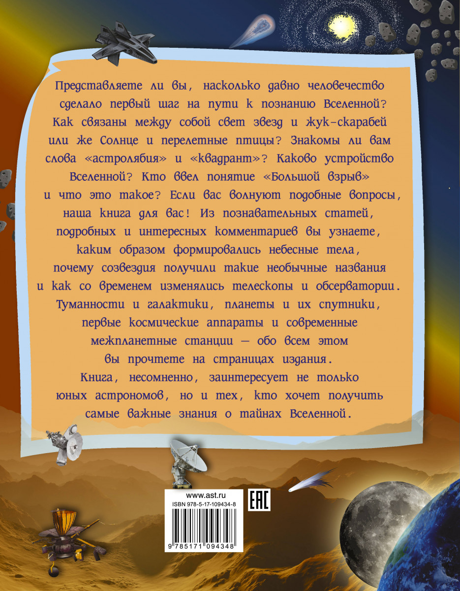 Представляете ли вы, насколько давно человечество сделало первый шаг на пути к познанию Вселенной? Как связаны между собой свет звезд и жук-скарабей или же Солнце и перелетные птицы? Знакомы ли вам слова "астролябия" и "квадрант"? Каково устройство Вселенной? Кто ввел понятие "Большой взрыв" и что это такое? Если вас волнуют подобные вопросы, наша книга для вас! Из познавательных статей, подробных и интересных комментариев вы узнаете, каким образом формировались небесные тела, почему созвездия получили такие необычные названия и как со временем изменялись телескопы и обсерватории. Туманности и галактики, планеты и их спутники, первые космические аппараты и современные межпланетные станции - обо всем этом вы прочтете на страницах издания. Книга, несомненно, заинтересует не только юных астрономов, но и тех, кто хочет получить самые важные знания о тайнах Вселенной.