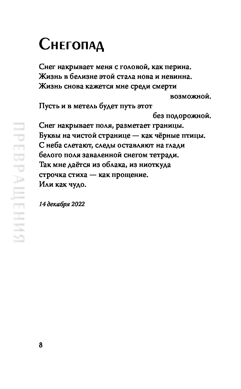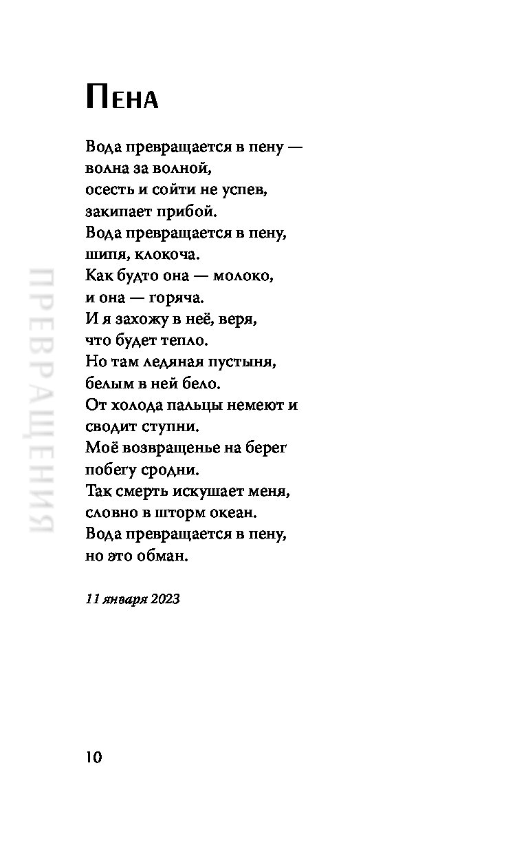 «Это очень смелая поэзия, чувственная, откровенная. Зрелое, мощное поэтическое высказывание. Контур души человека, живущего без кожи, человека открытого и в то же время мучительно скрытного, одинокого, жаждущего любви. Женщины, умеющей отзываться на чужую боль, переживая её каждой своей частичкой как собственную». — Анна Матвеева