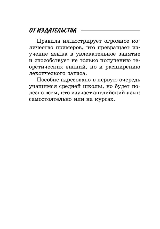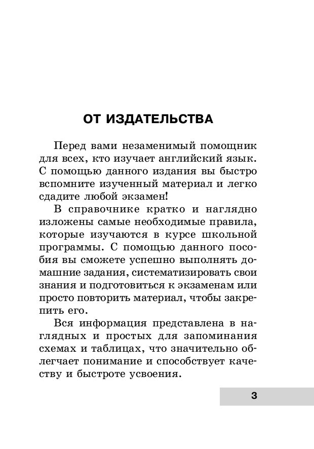 Эта книга предназначена для всех любителей английского языка, которым дорого время, а материал нужно повторить быстро. Справочником легко пользоваться как дома, так и по дороге на работу, а также взять его с собой на отдых.