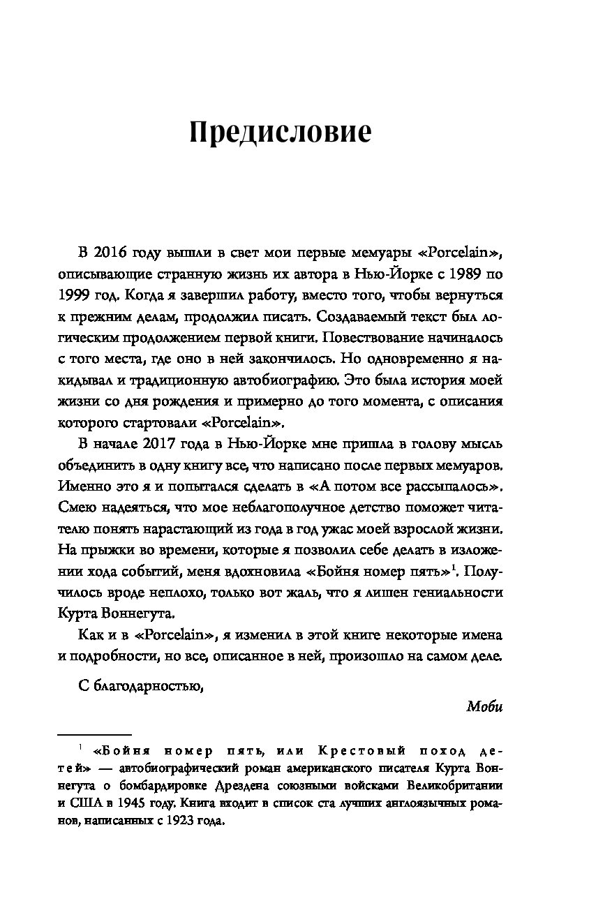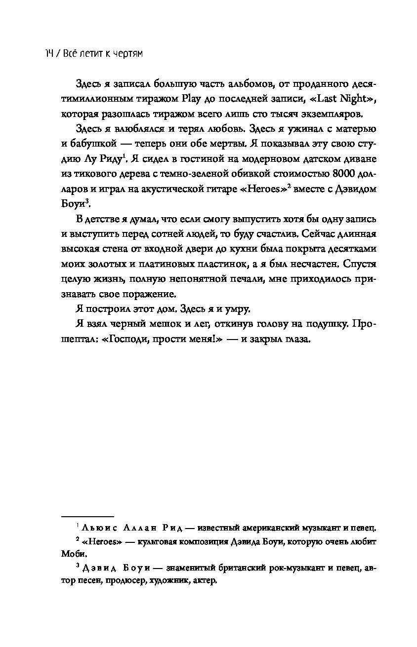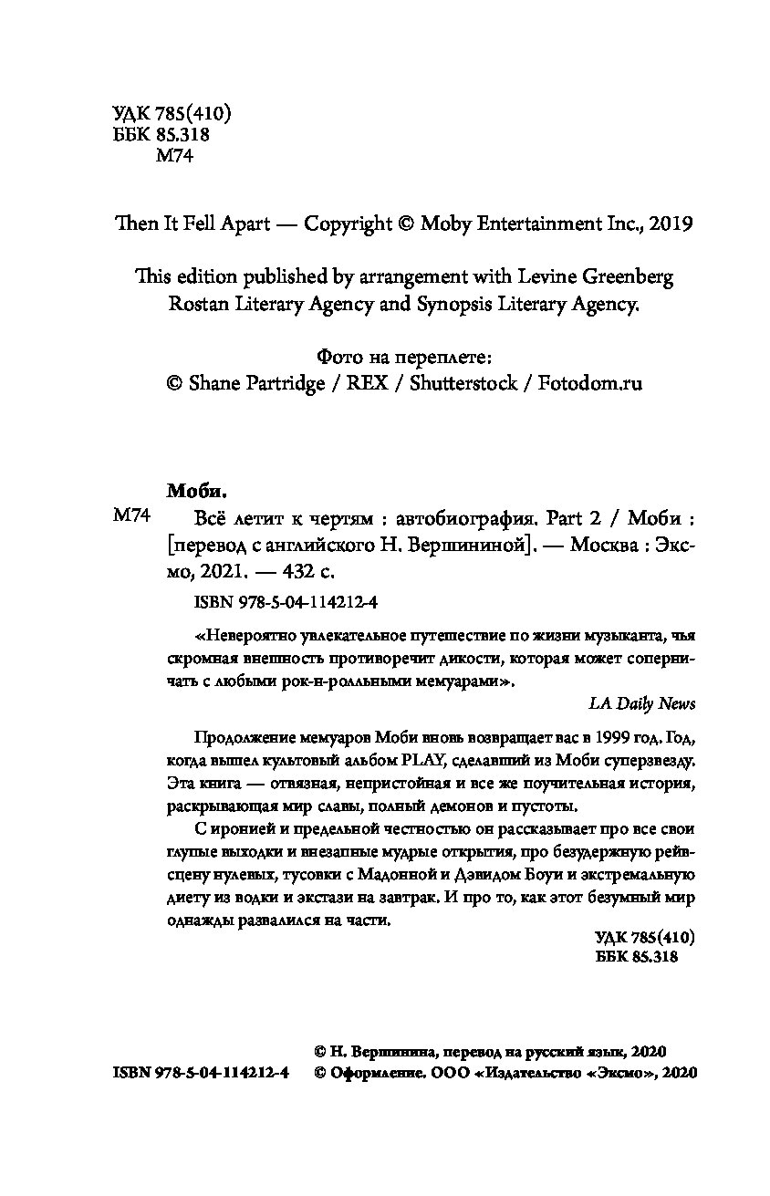 В своей второй книге мемуаров он предельно откровенно, иронично и душераздирающе рассказывает про безумные годы после выхода PLAY: тусовки с Дэвидом Боуи, Мадонной, Натали Портман, дикие выходки и пустоту, которая неизменно наступает потом. Но Моби знает, как из нее выбраться, даже если всё летит к чертям.