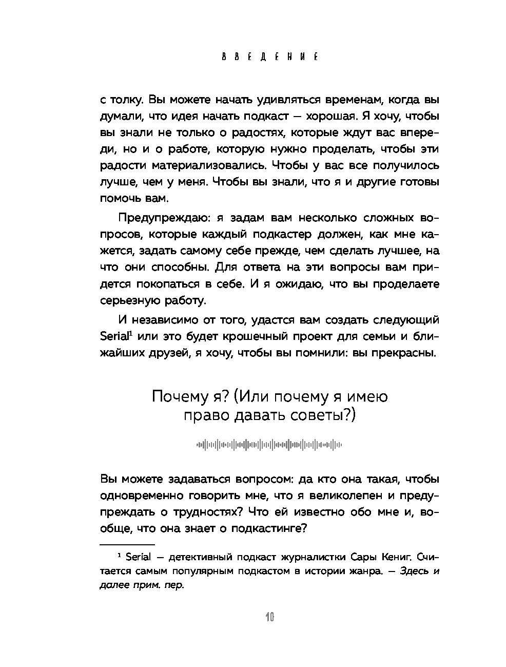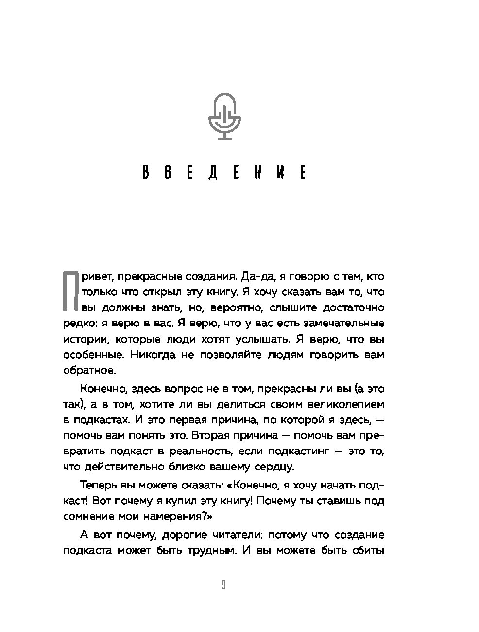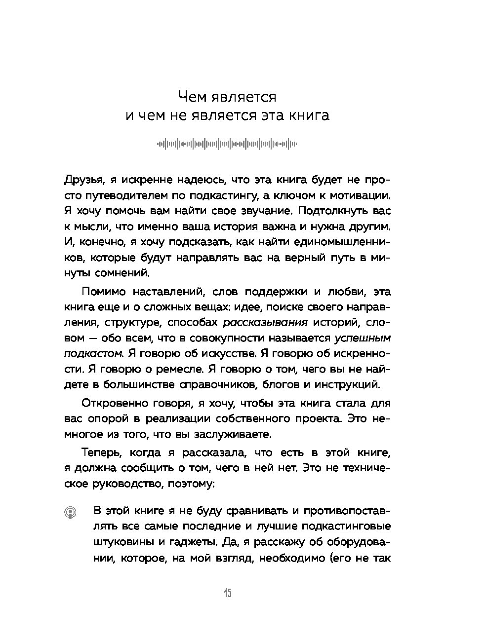 "Перед вами практическое пособие для тех, кто решил запустить свой подкаст с нуля. Оно начинается с главных вопросов. Зачем вы хотите начать подкаст? О чём будет ваше шоу? Для кого оно? Вопросы заставят задуматься, но не дадут передумать. Книга заряжена мотивацией, проникнута большим уважением, вниманием и верой в каждого, кто решится на запуск подкаста. Она хорошо переведена и легко читается. Несмотря на то, что автор опирается на данные американского рынка подкастов, этот опыт сработает и в России. Наш рынок пока не так развит, значит, меньше конкуренция и больше возможностей. Пробуйте! Лучшее время для старта - сейчас".
