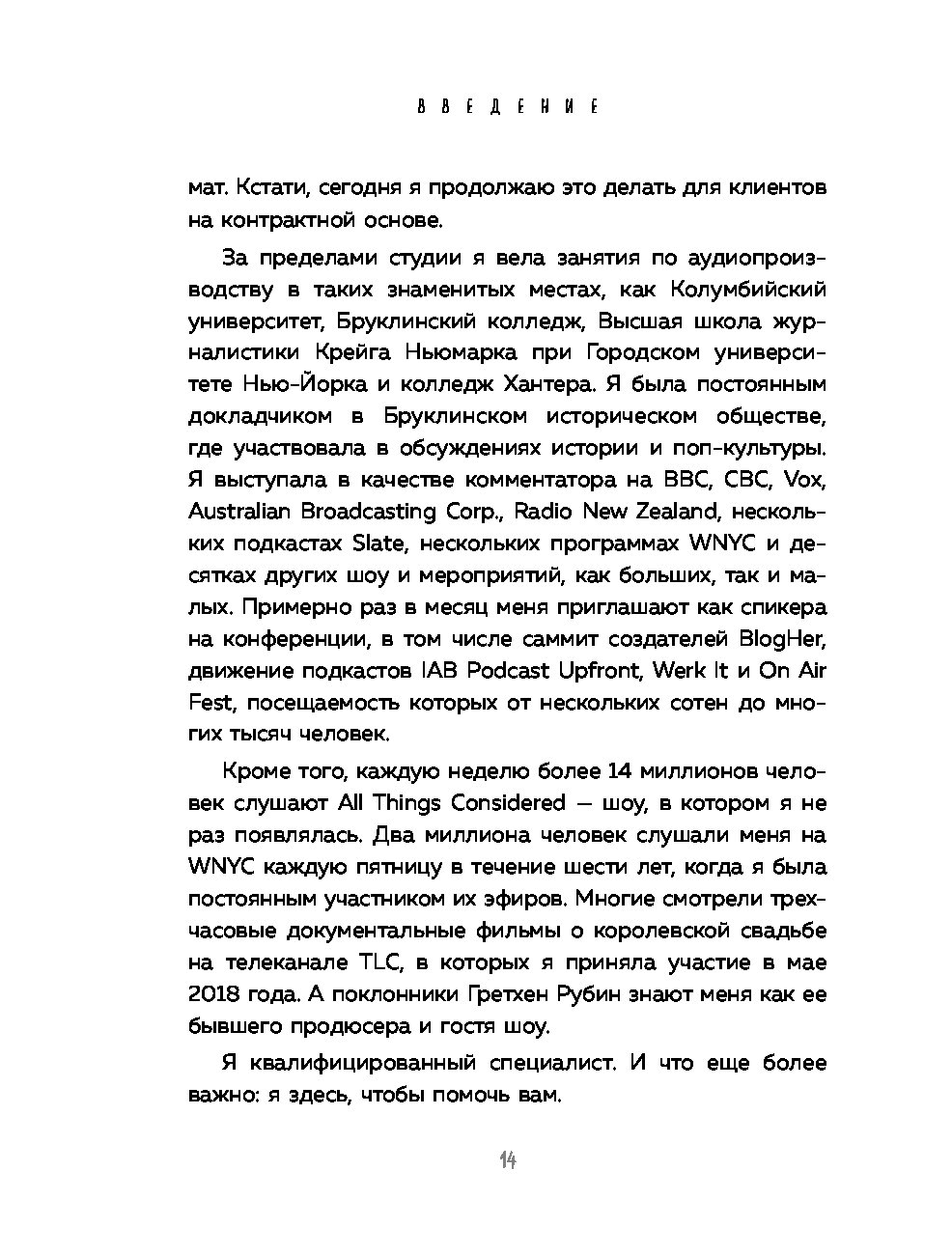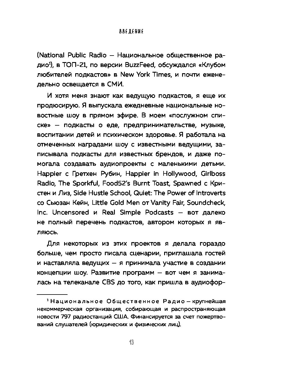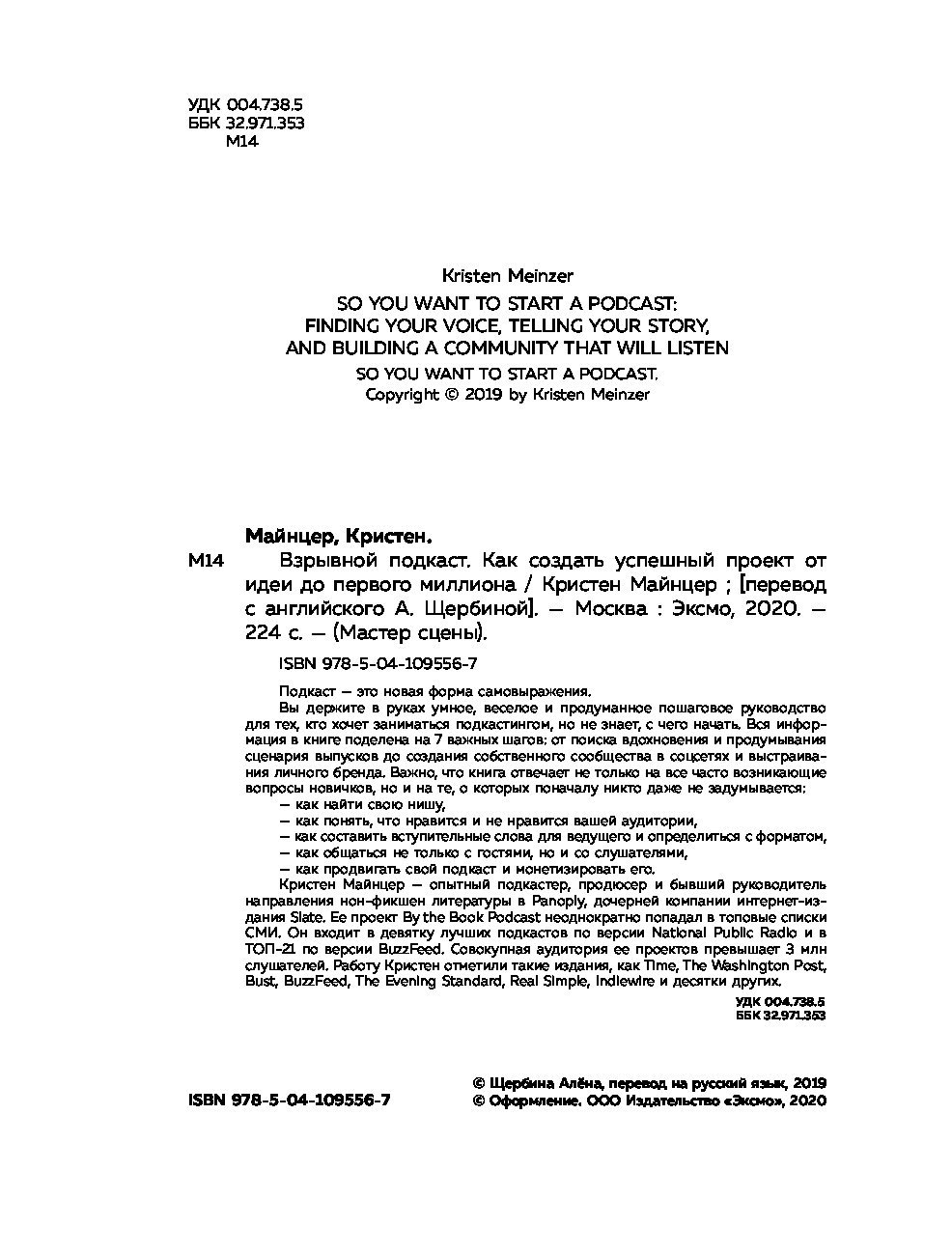 "Перед вами практическое пособие для тех, кто решил запустить свой подкаст с нуля. Оно начинается с главных вопросов. Зачем вы хотите начать подкаст? О чём будет ваше шоу? Для кого оно? Вопросы заставят задуматься, но не дадут передумать. Книга заряжена мотивацией, проникнута большим уважением, вниманием и верой в каждого, кто решится на запуск подкаста. Она хорошо переведена и легко читается. Несмотря на то, что автор опирается на данные американского рынка подкастов, этот опыт сработает и в России. Наш рынок пока не так развит, значит, меньше конкуренция и больше возможностей. Пробуйте! Лучшее время для старта - сейчас".