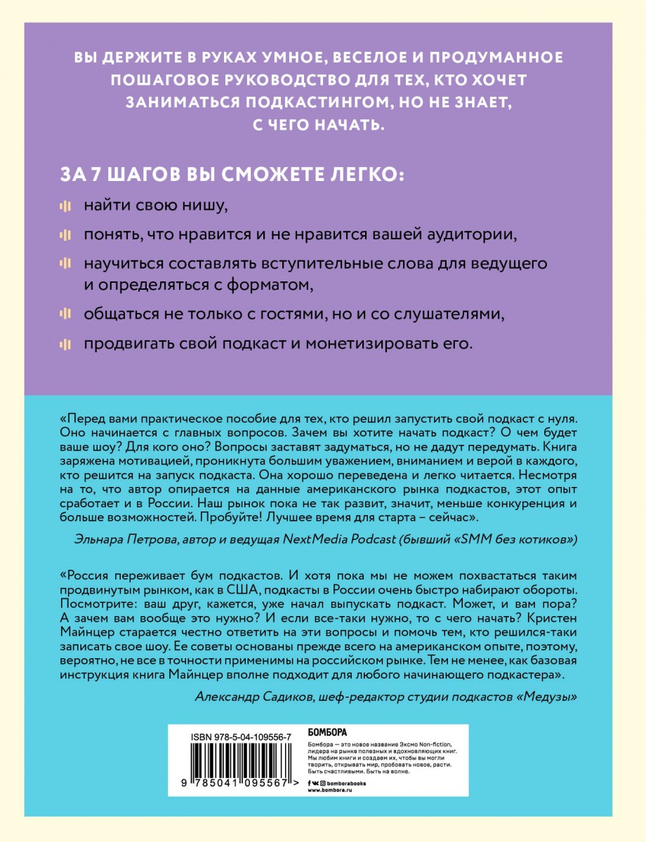 Это настоящая азбука для начинающих подкастеров! Она позволит вам не только избежать глупых ошибок, отнимающих время и силы, но и за 7 шагов создать успешный проект с большой и лояльной аудиторией. И на протяжении всего вашего пути автор будет вдохновлять и направлять вас.