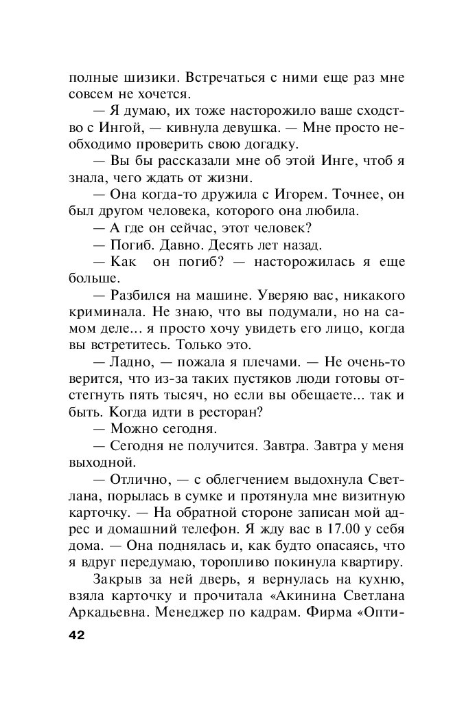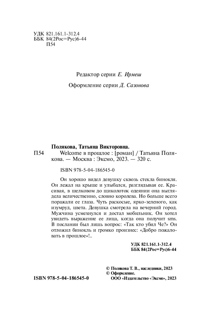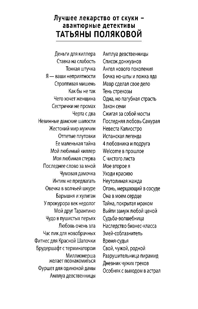 Татьяна Полякова — один из самых популярных российских писателей в жанре детектива. За время писательской карьеры из-под ее пера вышло более 85 книг общим тиражом более 36 миллионов экземпляров. По свидетельствам читателей, романы Татьяны Поляковой — это «захватывающий сюжет и непредсказуемая развязка, обаятельные герои и невероятные приключения, легкий стиль и яркие диалоги».