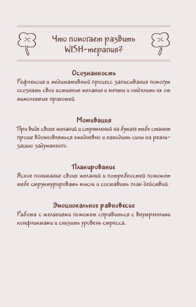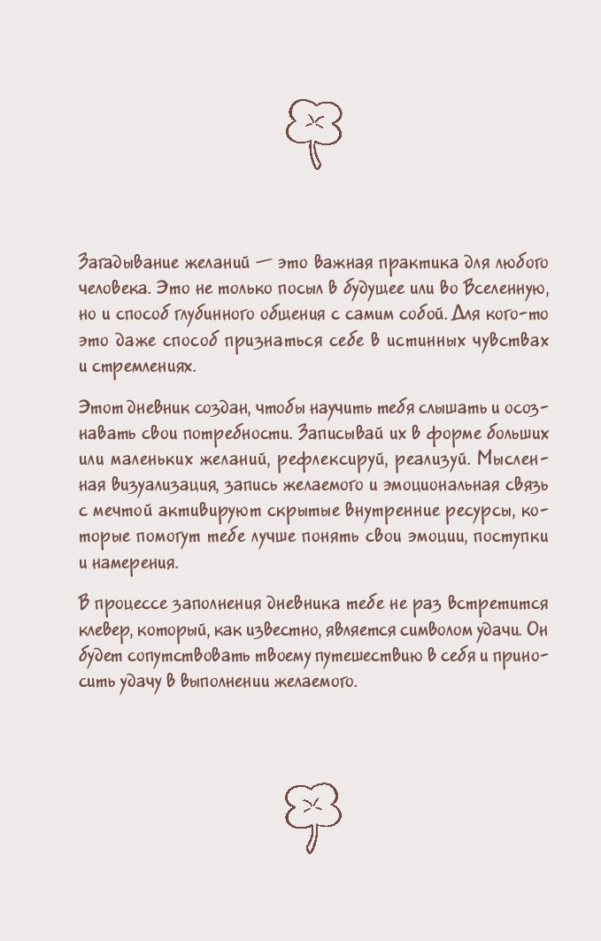 Дневник предлагает окунуться в самопознание через курс терапии желаниями и познакомиться ближе с тем, что кроется глубоко внутри тебя. Он помогает развить осознанность, мотивацию, планирование и укрепить эмоциональное равновесие.