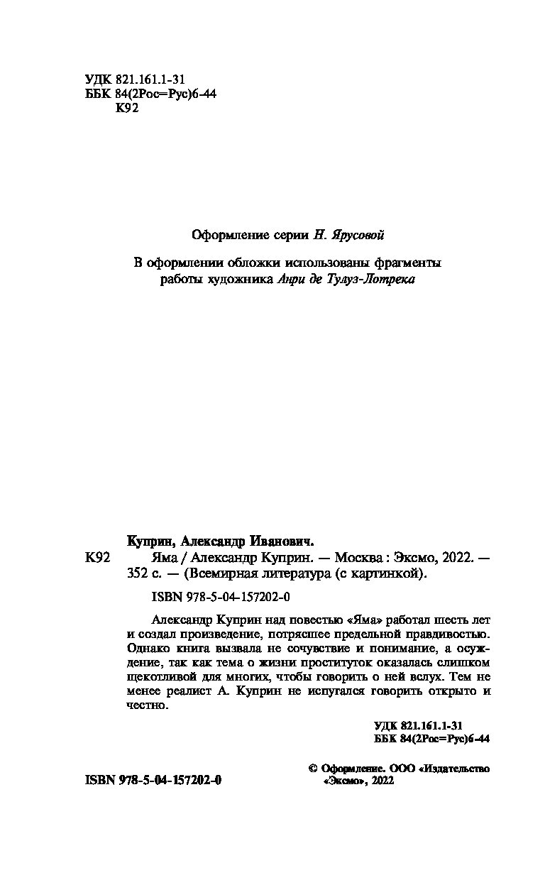 Александр Куприн над повестью «Яма» работал шесть лет и создал произведение, потрясшее предельной правдивостью. Однако книга вызвала не сочувствие и понимание, а осуждение, так как тема о жизни проституток оказалась слишком щекотливой для многих, чтобы говорить о ней вслух. Тем не менее реалист А. Куприн не испугался говорить открыто и честно.