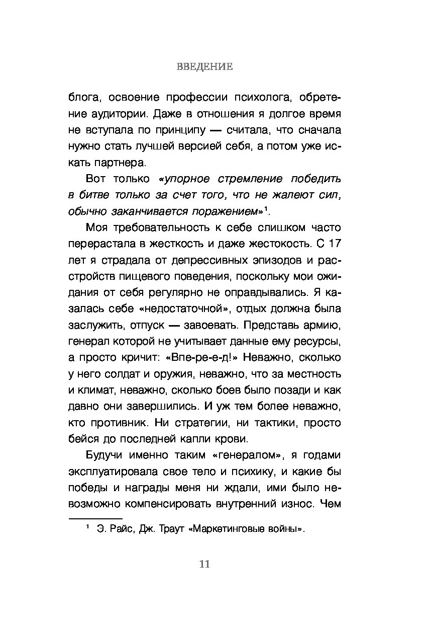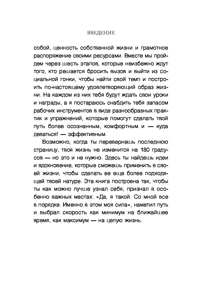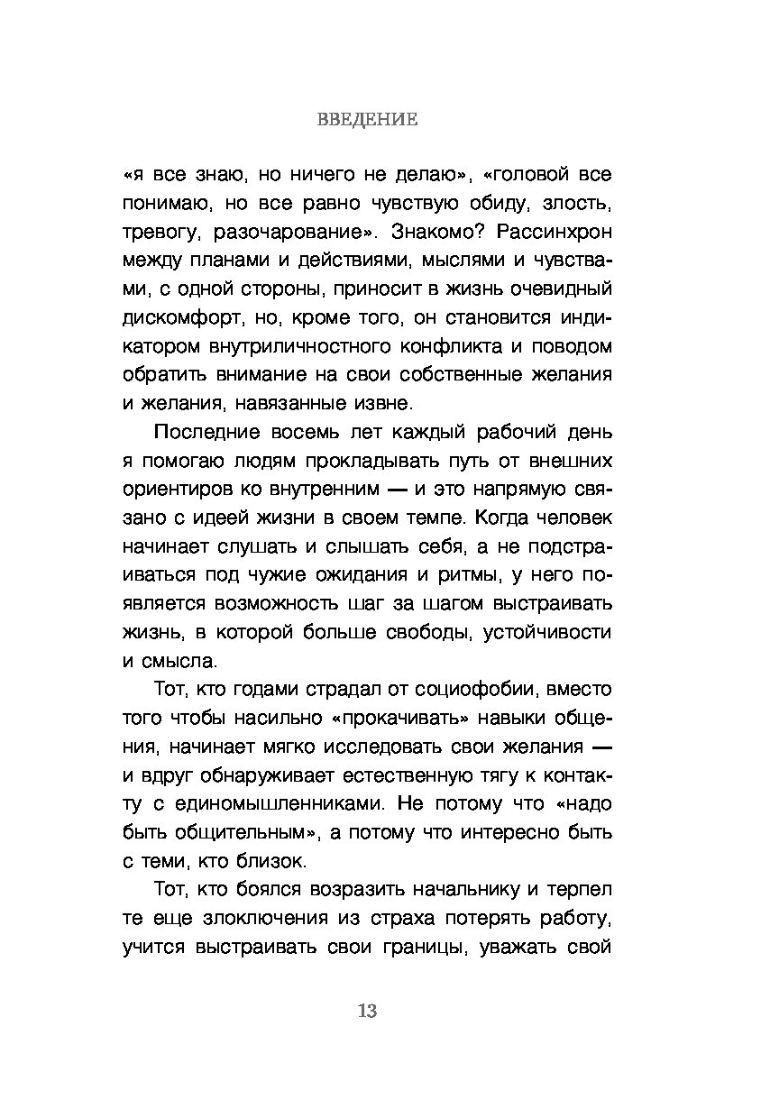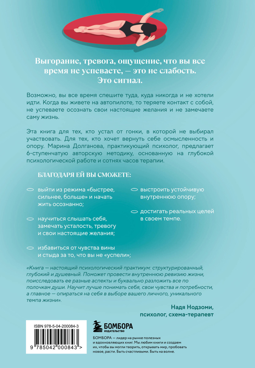 «Книга — настоящий психологический практикум: структурированный, глубокий и душевный. Поможет провести внутреннюю ревизию жизни, поисследовать ее разные аспекты и буквально разложить все по полочкам души. Научит лучше понимать себя, свои чувства и потребности, а главное — опираться на себя в выборе вашего личного, уникального темпа жизни». — Надя Нодзоми, психолог, схема-терапевт