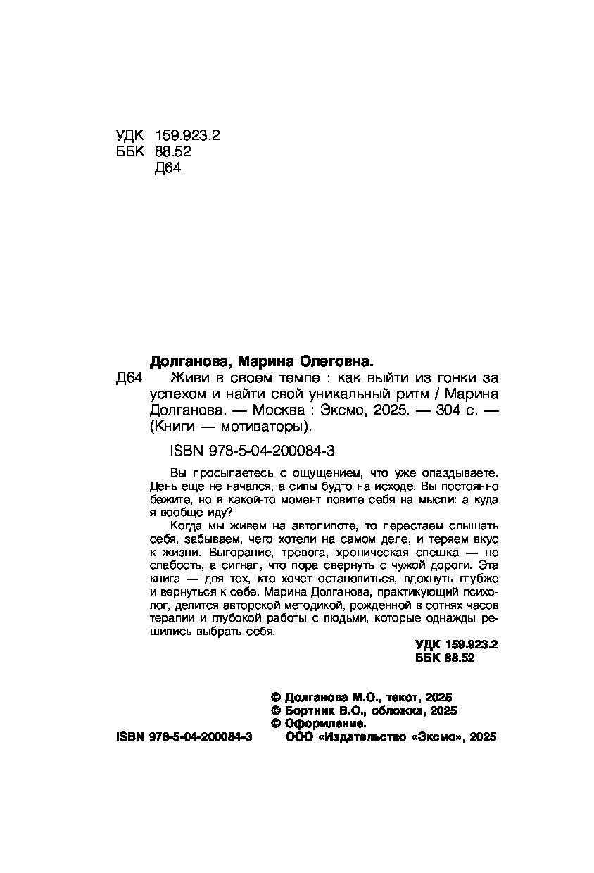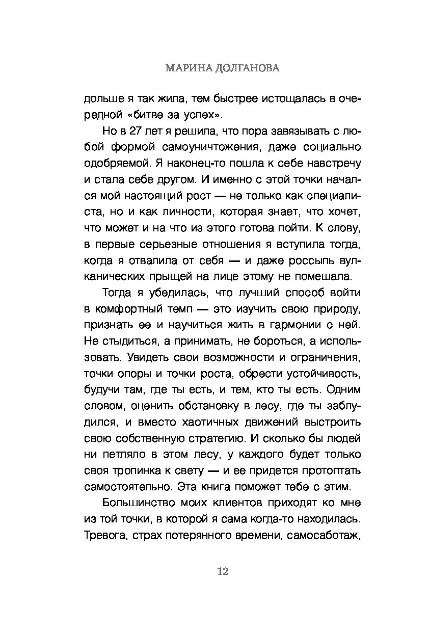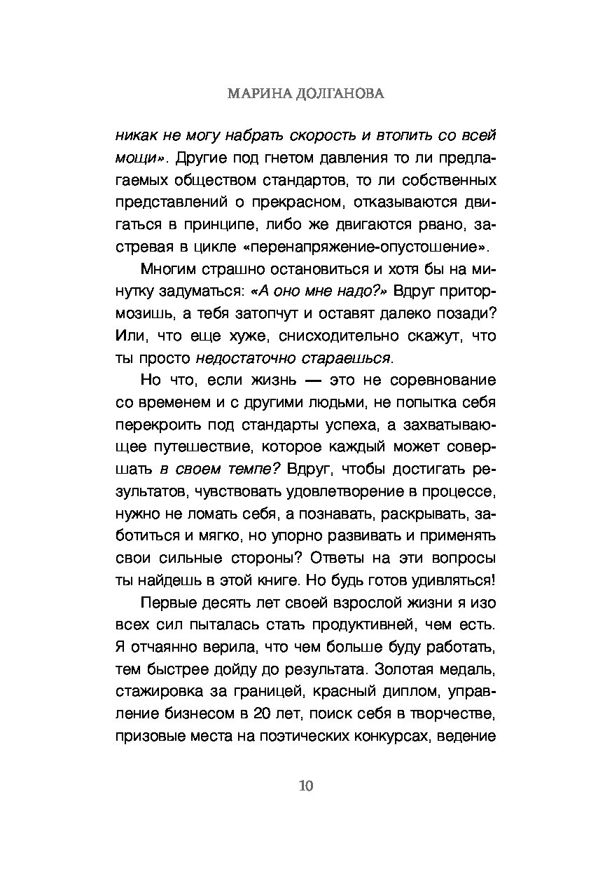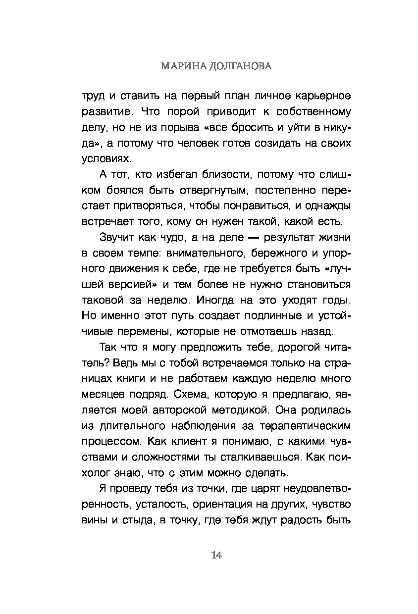 Эта книга — для тех, кто устал от гонки, в которой не выбирал участвовать. Для тех, кто хочет вернуть себе осмысленность и опору. Марина Долганова, практикующий психолог, предлагает 6-ступенчатную авторскую методику, основанную на глубокой психологической работе и сотнях часов терапии.