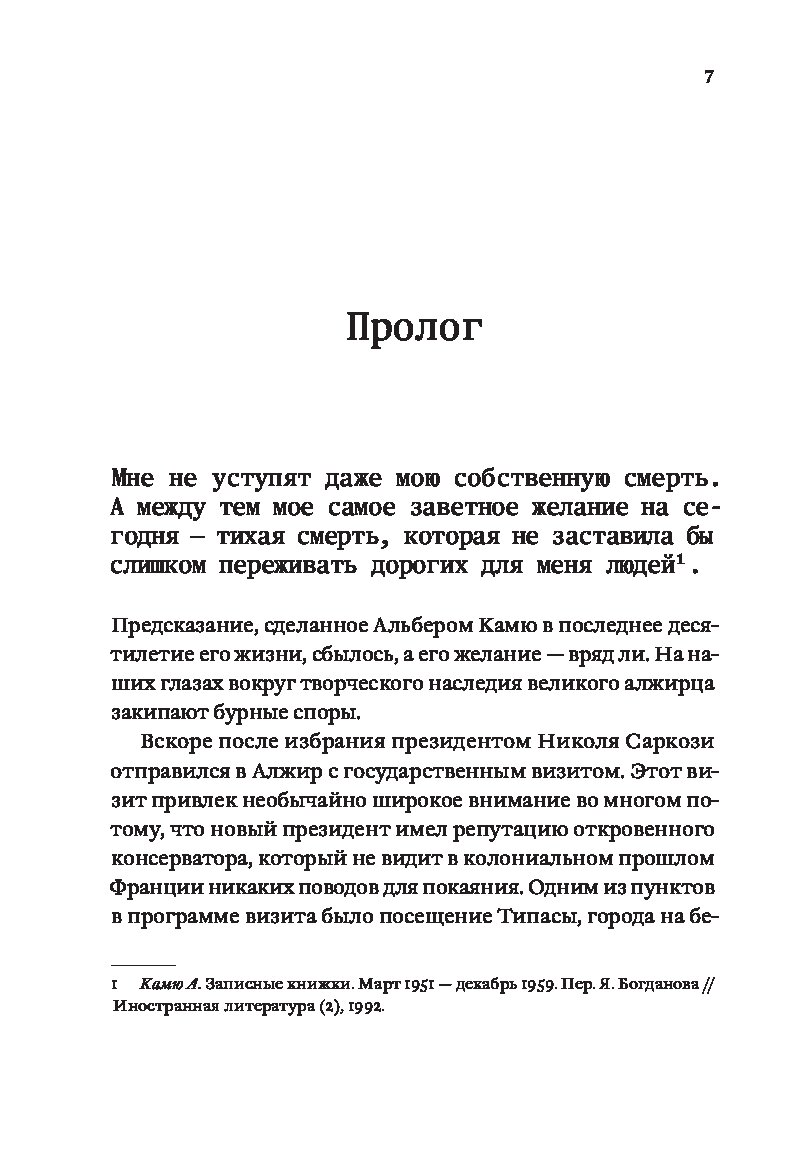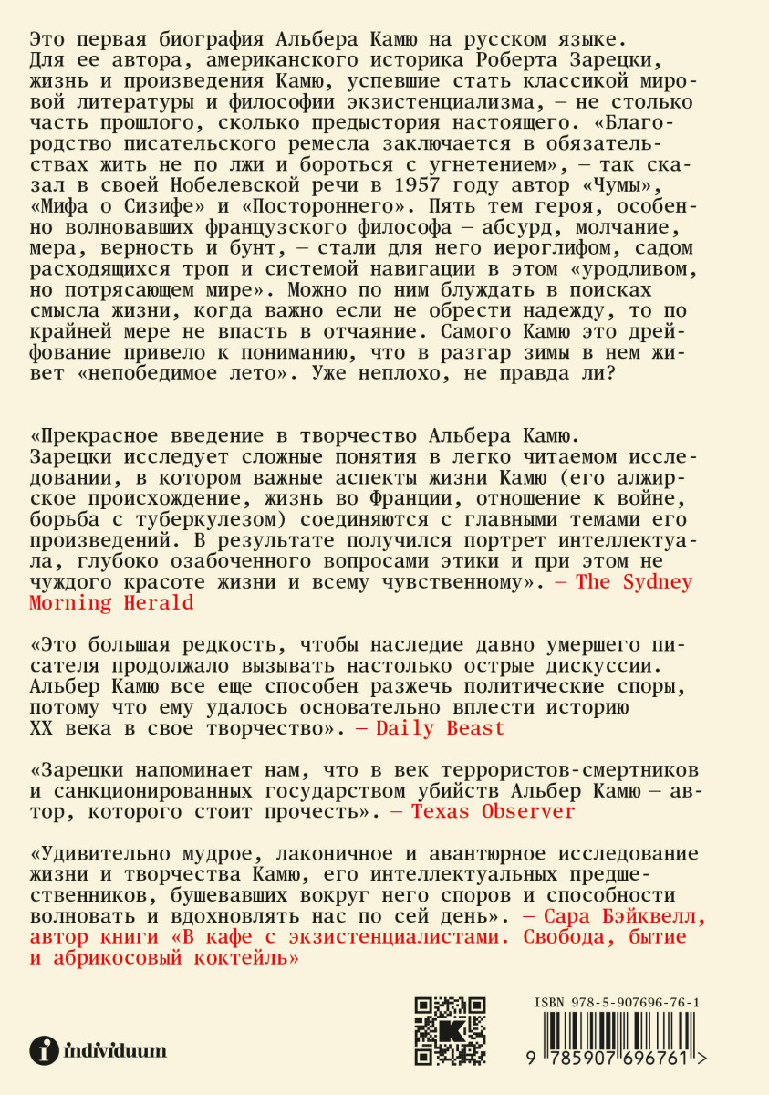 Это первая биография Альбера Камю на русском языке. Для ее автора, американского историка Роберта Зарецки, жизнь и произведения Камю, успевшие стать классикой мировой литературы и философии экзистенциализма, — не столько часть прошлого, сколько предыстория настоящего. «Благородство писательского ремесла заключается в обязательствах жить не по лжи и бороться с угнетением», — так сказал в своей Нобелевской речи в 1957 году автор «Чумы», «Мифа о Сизифе» и «Постороннего». Пять тем героя, особенно волновавших французского философа — абсурд, молчание, мера, верность и бунт, — стали для него иероглифом, садом расходящихся троп и системой навигации в этом «уродливом, но потрясающем мире». Можно по ним блуждать в поисках смысла жизни, когда важно если не обрести надежду, то по крайней мере не впасть в отчаяние. Самого Камю это дрейфование привело к пониманию, что в разгар зимы в нем живет «непобедимое лето». Уже неплохо, не правда ли?