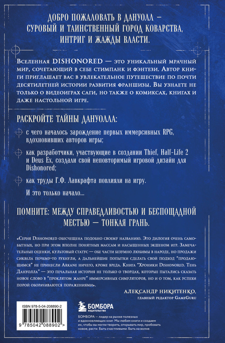 «Серия Dishonored обесчещена подобно своему названию. Это дилогия очень самобытных, но при этом вполне понятных массам и насыщенных экшеном игр. Замечательные оценки, культовый статус — обе части безумно любимы в народе, но продажи сиквела почему-то рухнули, а дальнейшие попытки сделать свой подход "продающимся" не принесли Arkane ничего, кроме вреда. Книга "Хроники Dishonored. Тень Дануолла" — это не только печальная история о творцах, которые пытались сказать новое слово в "проклятом жанре" иммерсивных симуляторов, но и о том, как успехи порой оборачиваются поражениями». — Александр Никитенко, главный редактор GameGuru.ru