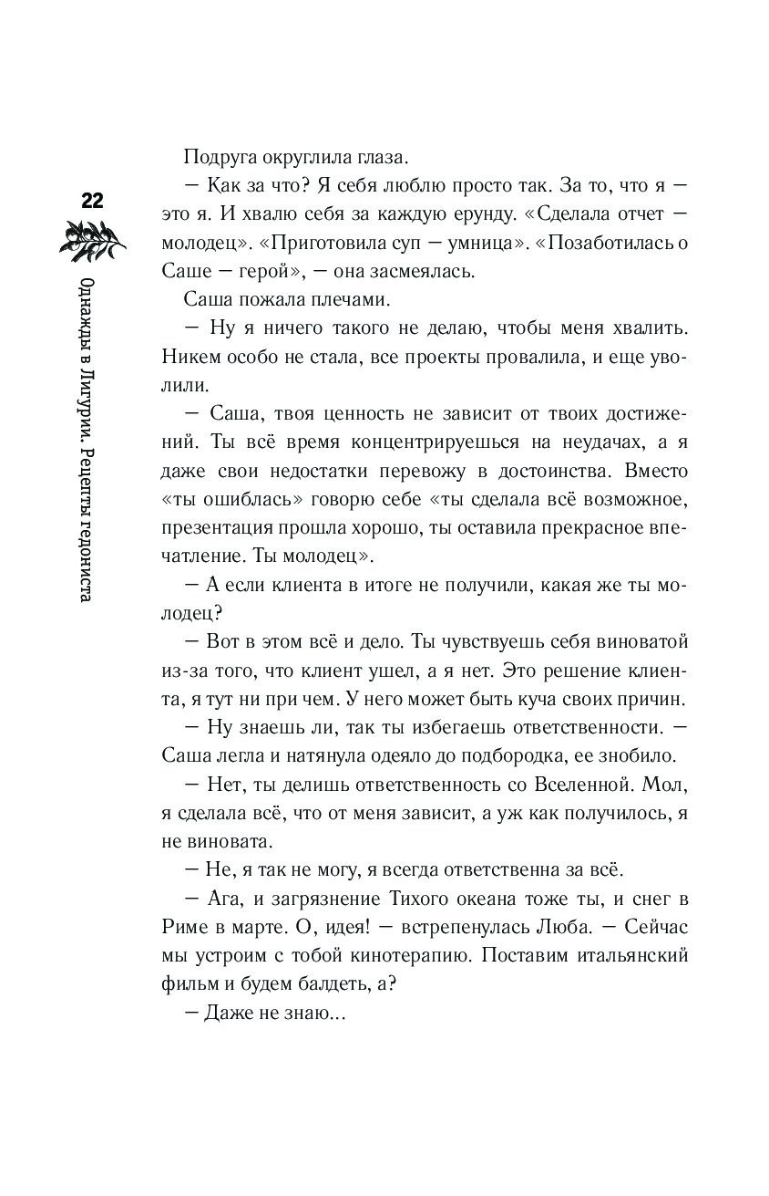 Новый роман Лидии Давыдовой расскажет вам, что значит быть гедонистом. Познавая красоту и кухню Италии, научитесь видеть прекрасное и в вашей жизни: кружка ароматного чая, уютный свитер, зеленый скверик в соседнем дворе, шум ветра в деревьях. Ведь подобные мелочи часто проходят мимо нас. Вместе с героиней узнайте, как сделать свою жизнь наполненной силой момента и получать удовольствие от каждого проживаемого дня.