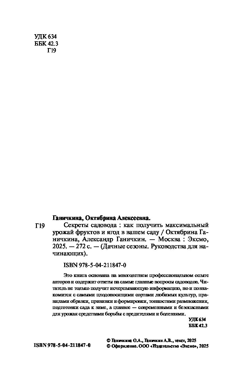 Октябрина Ганичкина — кандидат сельскохозяйственных наук, постоянная ведущая рубрик по приусадебному хозяйству в популярных телепередачах. Александр Ганичкин — дипломированный ученый-агроном. Эта книга объединяет многолетний профессиональный опыт авторов и содержит ответы на самые частые вопросы, которые возникают при выращивании плодовых и ягодных культур. Вы найдете информацию о самых плодоносящих сортах, посадке и пересадке, прививке, обрезке, формировке, подготовке сада к зиме, а главное — о безопасных и современных средствах защиты от вредителей и болезней.